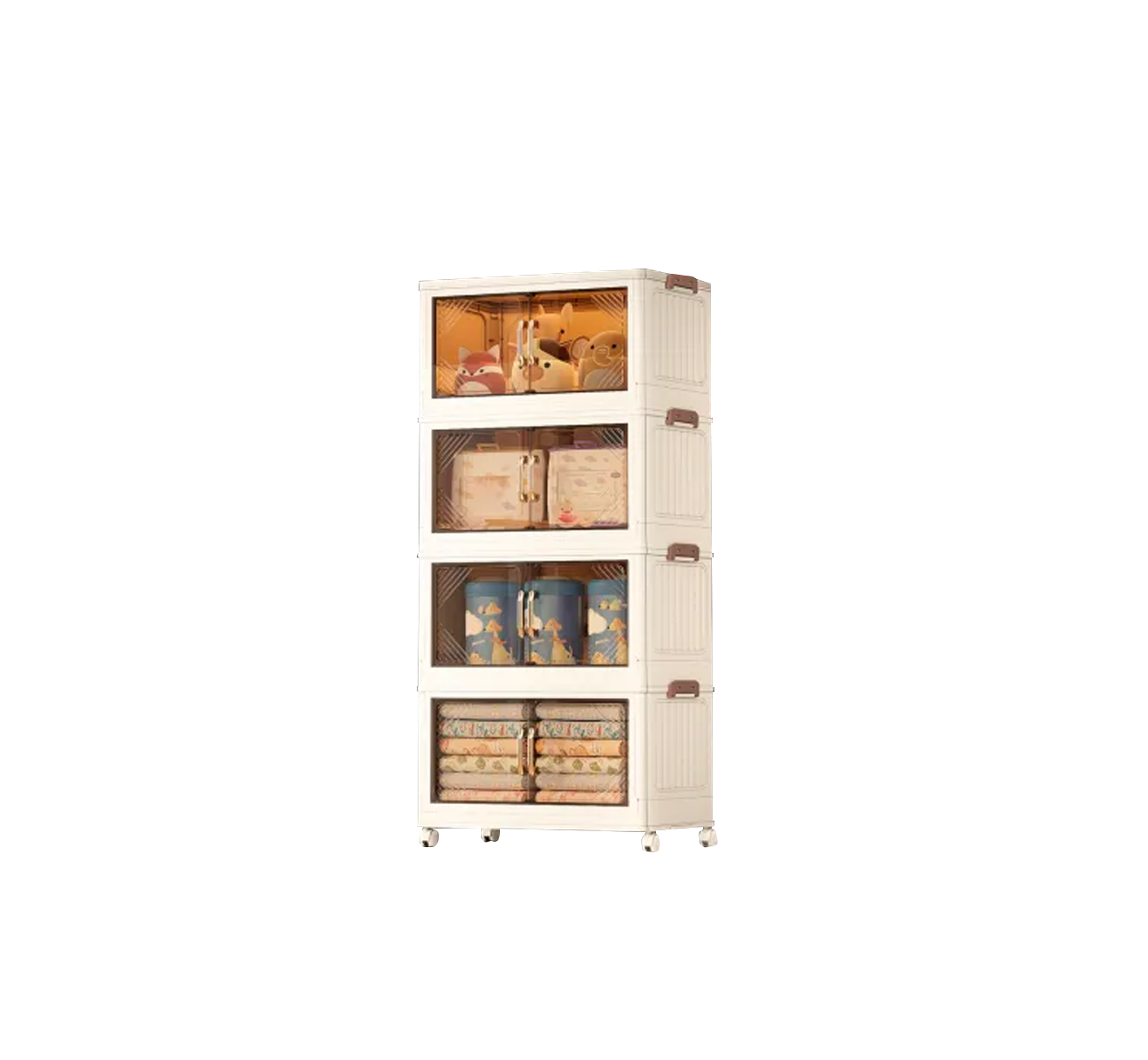 ARMARIO PLEGABLE 65 x 143 CM – WDFWFCB2165 Gabinete plegable de 4 niveles Carga max.: 30kg Tamano: 650x390x1430mm Tamano de 1 nivel: 650x390x340mm Tamano del paquete: 652x410x265mm Color: El cuerpo del gabinete es crema + El panel es transparente Material: PP Peso: 8250g Con cuatro ruedas giratorias de 2” Material de la rueda: plastico PP