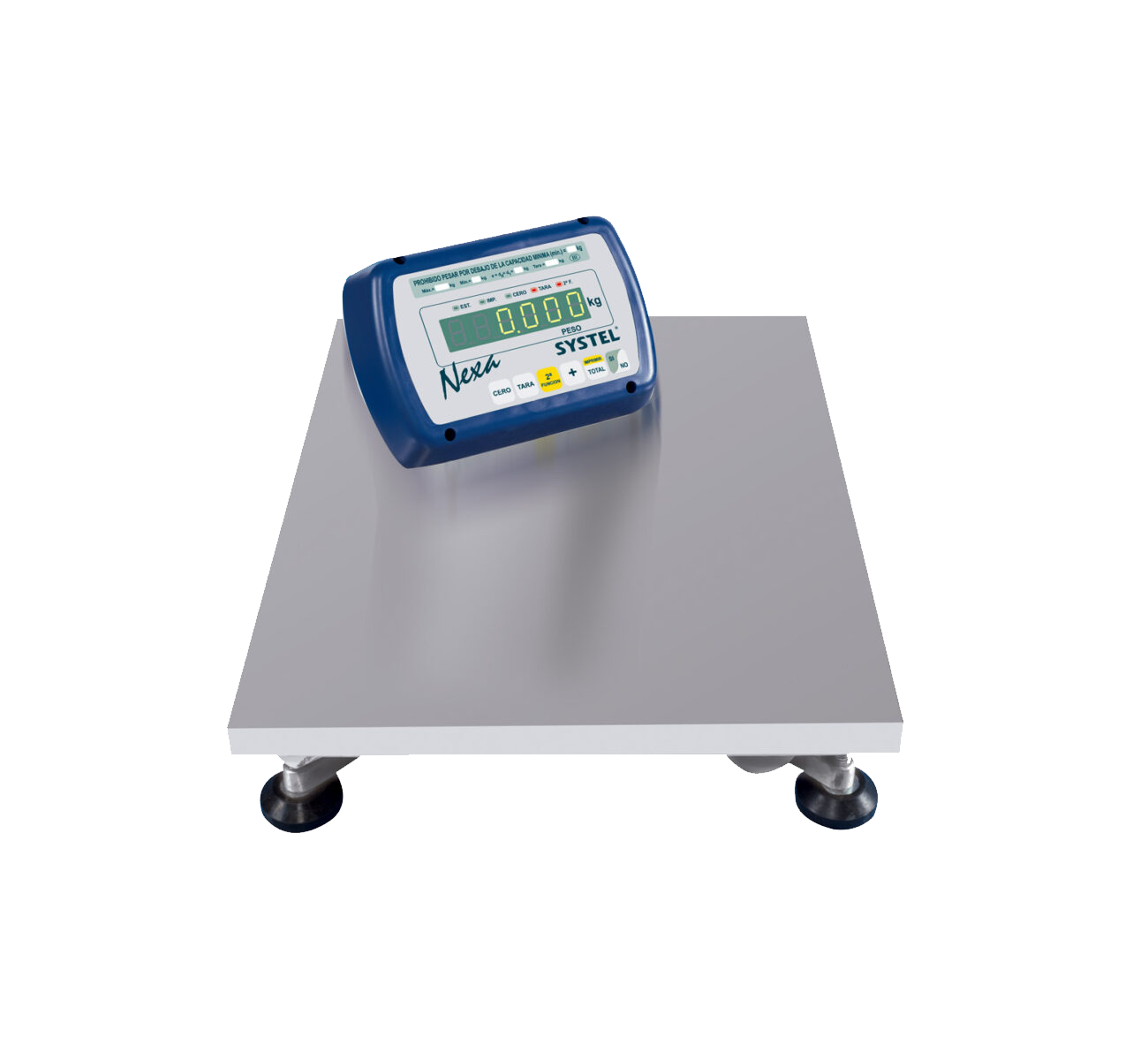 Báscula de plataforma electrónica. Modelo: NEXA Tipo de solución: industrial Modelo SP, informa solo peso Información de detección de errores. Plataforma de acero inoxidable de 570 x 450 mm Comunicación Serie (Norma RS 232) para conexión a PC o impresor Señalización de estabilidad, impresión, cero, tara y segunda función. Tara ingresable por peso Función acumulación de peso Teclado protegido con membrana impermeable. Celda con protección al sobrepeso Alimentación 12 V mediante fuente de alimentación externa (110 V – 220 V – 50 Hz- 60 Hz) con certificación de Seguridad Eléctrica.