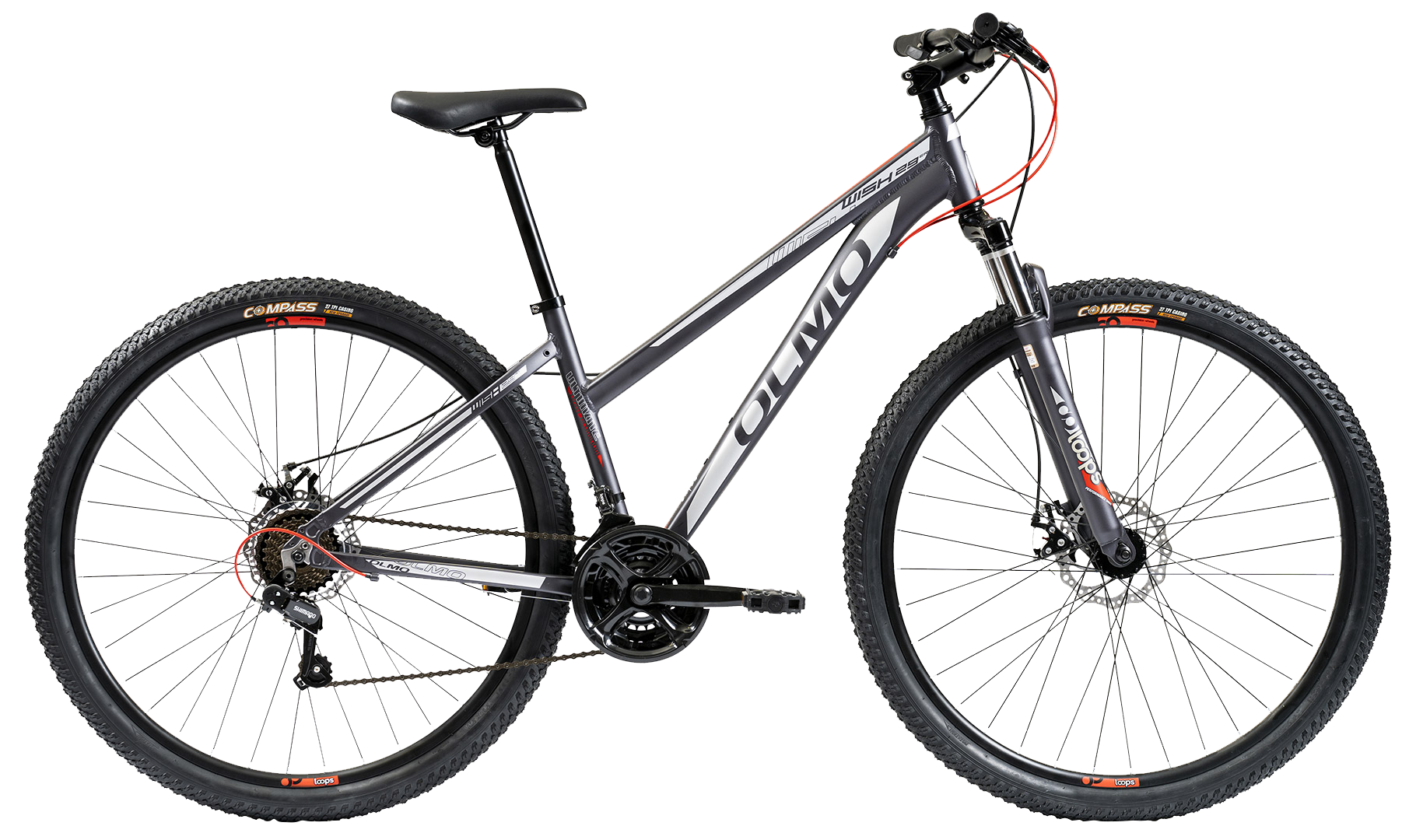 RODADO 29 CUADRO Aluminio 6061 con montaje para discos y portaequipaje TALLE 16 CAMBIO TRASERO Shimano TZ-31, 21 velocidades HORQUILLA Suspensión Loops FRENOS A disco mecánico DESTACADOS Llantas doble pared https:–olmobikes.net-bicicleta-wish-295-