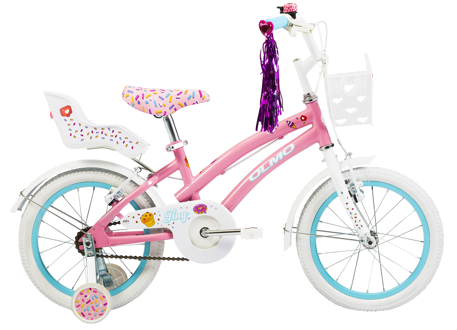 RODADO 16 CUADRO Acero HORQUILLA Rígida FRENOS V-Brake resina blancos DESTACADOS • Guardabarro • Cubrecadena • Canasto delantero • Portamuñeca • Estabilizadores • Flecos en los puños • Timbre