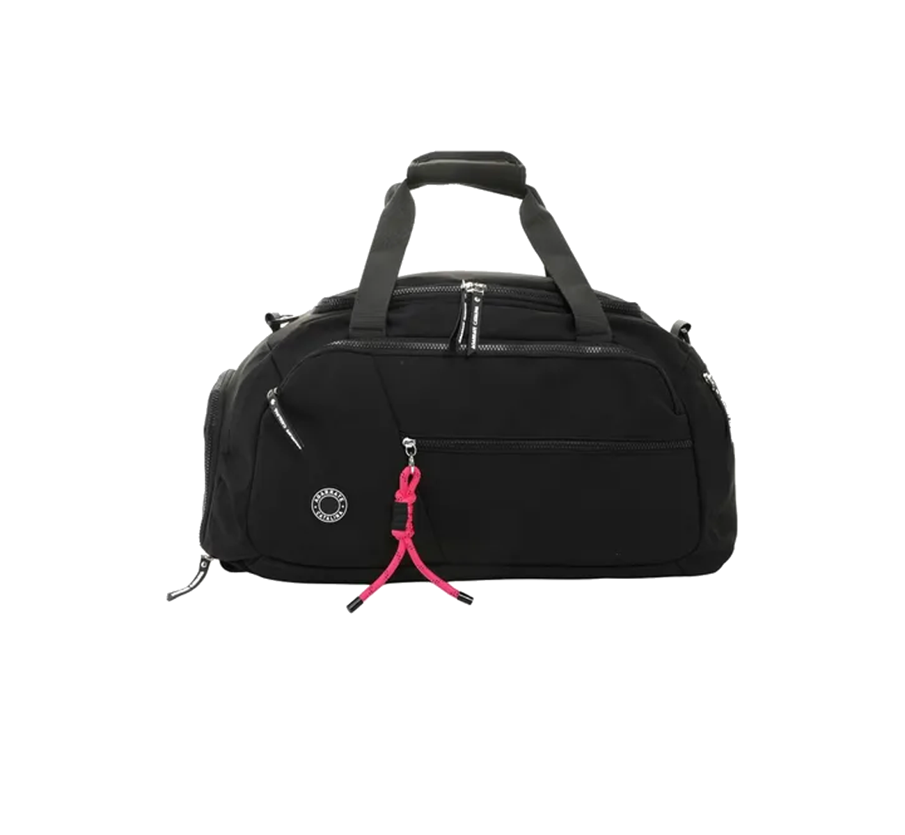 BOLSO CON CORREAS MOCHILERAS AMANDA AGARRATE CATALINA – ACBO09 Manijas superiores acolchadas para transporte manual comodo. Amplio compartimiento principal con cierre y bolsillo interno con cierre. Correa desmontable y regulable para llevar al hombro. Compartimiento lateral independiente para calzado. Dos bolsillos frontales con cierre para objetos de acceso rapido. Bolsillo lateral adicional con cierre. Mosqueton con cordones decorativos al frente. Logo de la marca en goma que aporta un toque distintivo. Correas mochileras ajustables para llevarlo como mochila. Material: Poliester Alto: 28 cm Ancho: 54 cm Profundidad: 21 cm Peso: 700 gramos