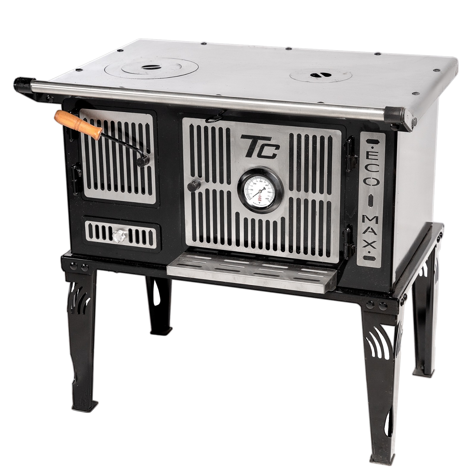 Cocina económica a leña MIKA 23 Frente: 81cm Largo: 50cm Largo + manija: 60cm Alto: 82cm Infernillo Frente: 20cm Alto: 29cm Profundo: 46cm Horno Frente: 36cm Alto: 29cm Profundo: 46cm Cenicero Frente: 18cm Alto: 9cm Profundo: 31cm Peso: 110kg Combustible: leña Salida: 100 mm