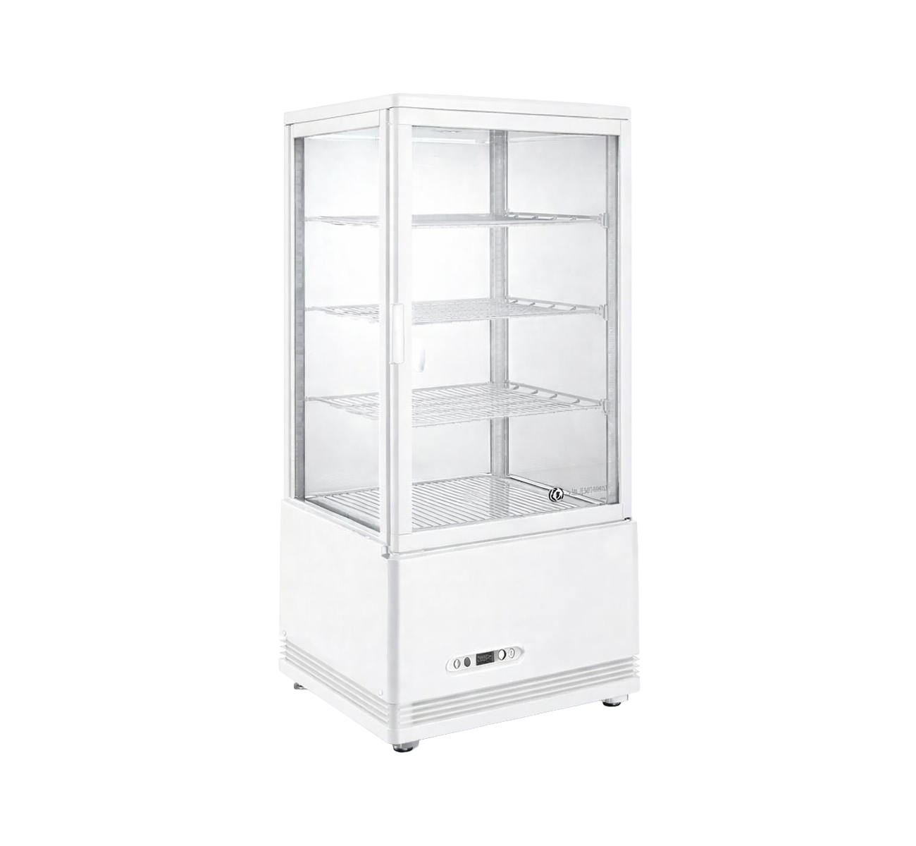 Heladera-Warmer Vertical 4 caras Vidriadas 78 Lts Iluminacion en 4 esquinas Controlador digital de temperatura Estantes ajustables en altura Puerta frontal de DVH 4 Caras DVH – visibilidad total sin abrir puertas Base con pies Sistema de enfriamiento forzado Sistema calefaccion superior con aire circulante Frio y calor intercambiables con tecla indicadora Descongelamiento automatico Capacidad bruta: 78 Lts Rango de temperatura: 0-12 °C Funcion Heladera – 30-60 °C Funcion Warmer Conexion electrica: 220 V Refrigerante: R134a Peso neto: 36 Kgs Dimension total: 452 x 406 x 966 mm