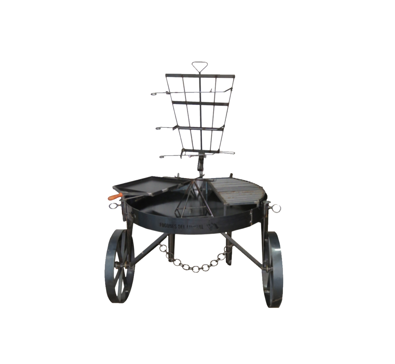 Fogon Carreta Litoraleno Construido en chapa de 1-8 (3,2 de espesor) con 1000 mm de diametro, un aro circular de 120 mm y 3,2 de espesor de borde. Tiene 750 mm de altura y dos ruedas de hierro con banda de 1-8 y rayos de planchuela de 1 pulgada x ⅛, con un diametro de 520 mm . Estas estan sostenidas por un soporte de 1-8 , dos patas de cano redondo de 2 pulgadas y posee dos manijas de 1 ¼ pulgadas de 750 mm . Tambien posee cadenas decorativas y una puerta frontal para facilitar la limpieza. Incluye: Una piramide de fuego construida en hierro del 8 trefilado con una medida de 230 mm por lado, 260 mm de alto y en su parte superior cuenta con una cruz de 290 mm por lado que ademas de servir para separar los lenos se puede utilizar como hornalla para discos, ollas, etc. Una parrilla semicircular reforzada construida en hierro angulo de 5-8 x 1-8 ,planchuela de 5-8 y emparrillado de hierro del 8 trefilado. Tiene 710 mm de frente, 360 mm en su parte mas profunda y una altura de 130 mm . Una estaca mediana construida con una columna de hierro trefilado de 13 mm, 4 travesanos de hierro T de 1 pulgada x 1-8 , 3 brazos de hierro trefilado de 8 mm moviles y pinchos de 6 mm con 3 trabas moviles de 4 puntos que permiten un mejor agarre de la pieza a cocinar. La estaca gira 360° sobre su eje y cuenta con una manivela. Una plancheta construida en chapa de 1-8 y su soporte en angulo de 5-8 x 1-8 ,tiene una medida de 400 mm x 400 mm y una profundidad de 20 mm. Esta plancheta posee una manija de madera que permite un giro de 360° sobre su eje y es regulable en altura. Este fogon esta equipado con adaptadores para el intercambio de todos nuestros accesorios (Estaca ,plancha ,etc.)