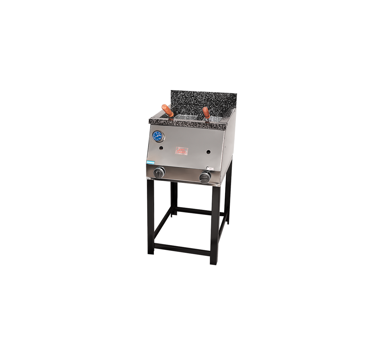 FREIDORAS INDUSTRIALES (MEDIA POLLERA) – Par 33Lts 33 Litros (5 lts. Agua-28 lts. Aceite) 2 canastos 160 x 310 mm 20.000 Calorias Frente: 540 – Profundidad: 550 – Altura: 870-970 mm Modelo 4 tubos INTERIOR: Bacha en chapa DD N° 18 Enlozada EXTERIOR: Laterales en chapa pre-pintada y frente acero inoxidable GASIFICACION: Piloto y tubo lanza llama de comando compartido.