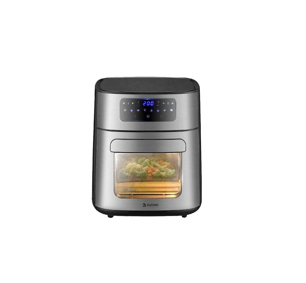 Freidora De Aire Suono Air Fryer 10 L Con Ventana 1700 W Potencia: 1700W Panel digital Capacidad: 10lts 8 programas de coccion Temporizador 0 a 60 minutos Temperatura 80º a 200º centigrados Material interior antiadherente 6 accesorios incluidos