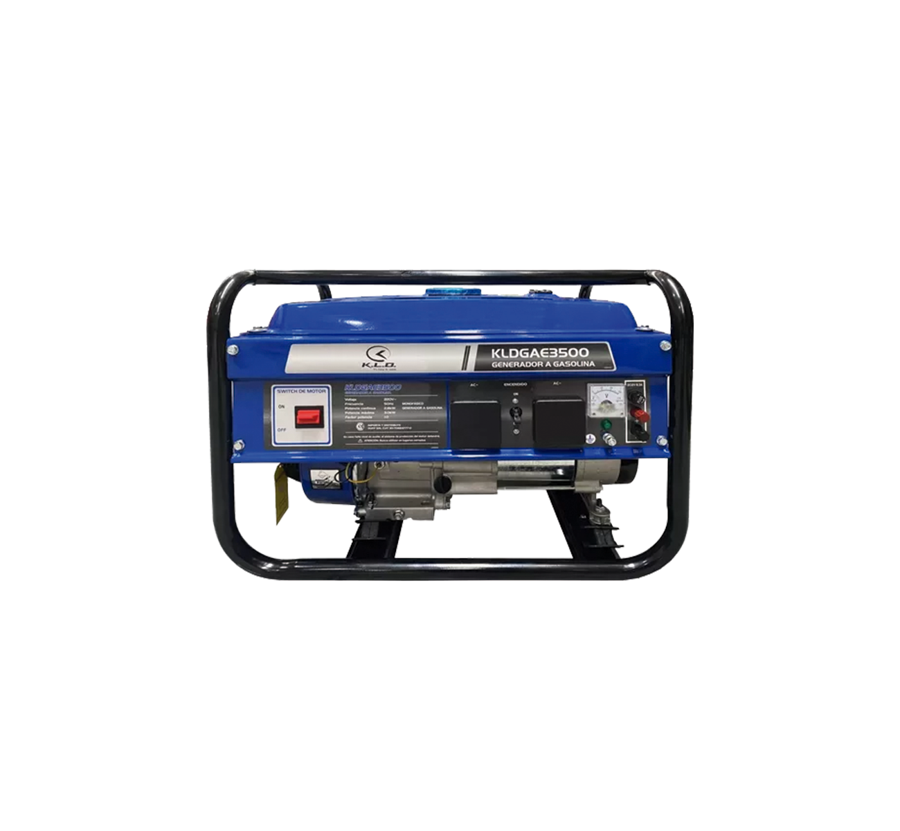 GENERADOR ELÉCTRICO NAFTA KLDGAE3500 Arranque MANUAL Potencia máxima de salida 3000 Watts 2.5 Kva Potencia nominal de salida 2800 Watts 2.2 Kva Factor de potencia 1.0 Combustible 13.5 Lts Aceite 0.6 Lts (20W50) Generador de AC a 220 V (2 enchufes) Generador de corriente DC 12 V / 10 amp Alerta de aceite AVR (regulador de voltaje) Voltímetro AC Llave térmica para circuito AC Y DC Arranque manual 9 a 10 hs de uso continuo (M¦XIMO) Cilindrada 210 cc 6.5 HP Incluye batería