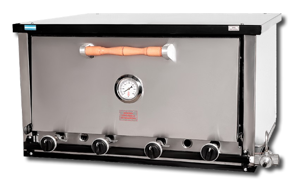 Gabinete aislado con lana mineral, realizado en chapa de acero inoxidable exterior e interior en chapa de Hº enlozada. Cuenta con 4 guías para opciones de niveles de cocción ó simultaneidad de bandejas. Puerta con bisagra pivotante frontal con tope de apertura. Incluye termómetro analógico de temperatura rango de 0ºC a 600ºC. Manija de puerta de material no conductivo de calor. El quemador del horno está realizado con 4 (cuatro) filas de caño de Hº 7/8 con doble hilera de perforación 2,25. Cada quemador tiene su robinete independiente para el mejor control y distribución de temperatura interna. Piso de ladrillo refractario
