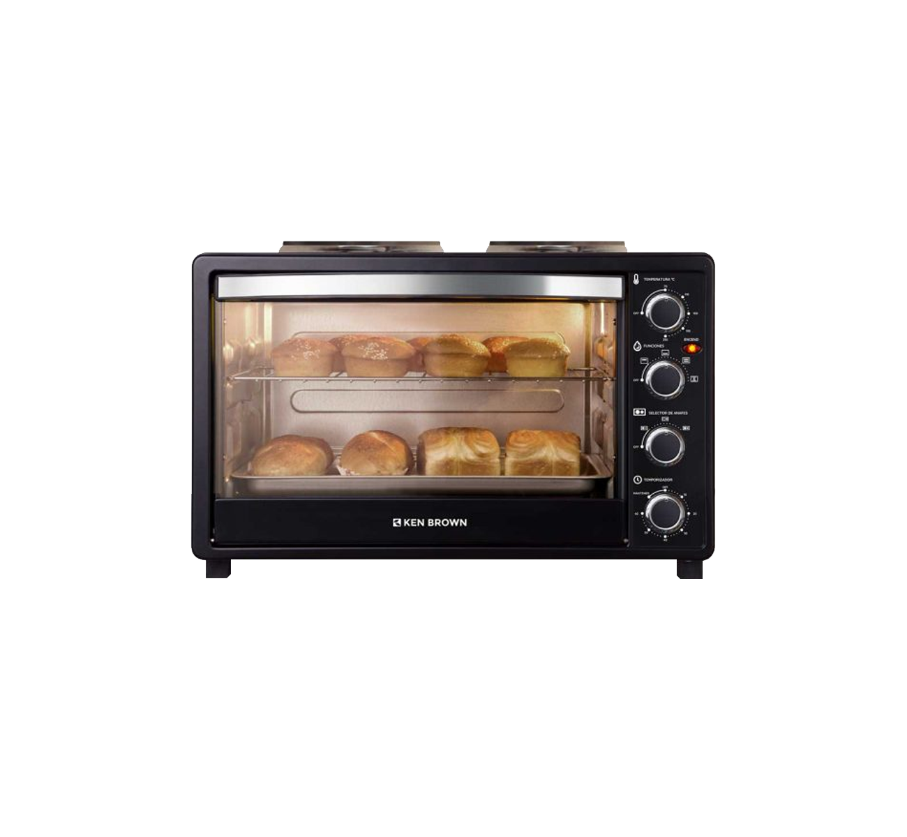 Horno electrico Ken Brown KB-4332 doble anafe Capacidad 43 litros Potencia 1600 Watts DOBLE anafe superior Funcion conveccion para horneado homogeneo Apagado automatico con timbre de aviso Funcion mantener encendido Termostato ajustable 5 posiciones de 70º A 230º Bandeja de coccion, rejilla metalica y pinza 3 posiciones, inferior, superior o combinados