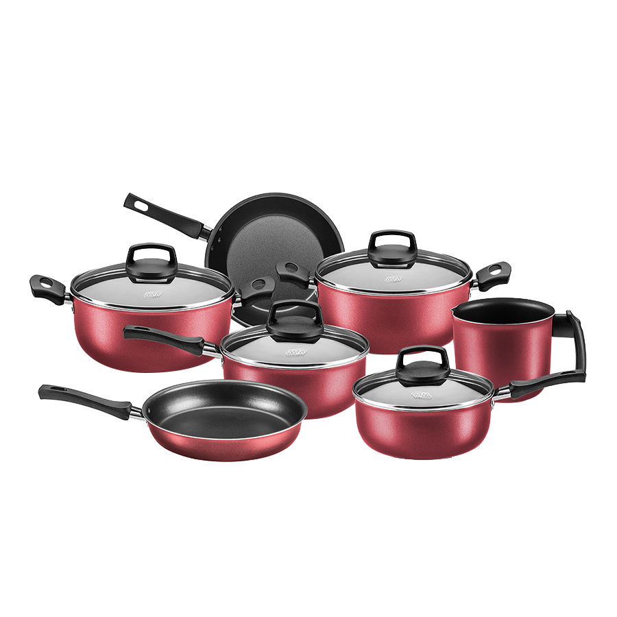 Composición: Cacerola c/mango y tapa vidrio : 16 cm | 1,40 lt | Espesor 1,2mm Cacerola c/mango y tapa vidrio : 18 cm | 1,70 lt | Espesor 1,2mm Cacerola c/asas y tapa vidrio: 20 cm | 2,40 lt | Espesor 1,2mm Cacerola c/asas y tapa vidrio: 22 cm | 3.30 lt | Espesor 1,2mm Sarten Francesa s/tapa: 20 cm | 0.90 lt | Espesor 1,2mm Sarten Alta s/tapa: 22 cm | 2.20 lt| Espesor 1,2mm Jarro N: 12 | 1,20 lt | Espesor 1,2mm Tapas de vidrio templado c/aro de acero y salida de vapor | Cabos y perillas de Bakelita