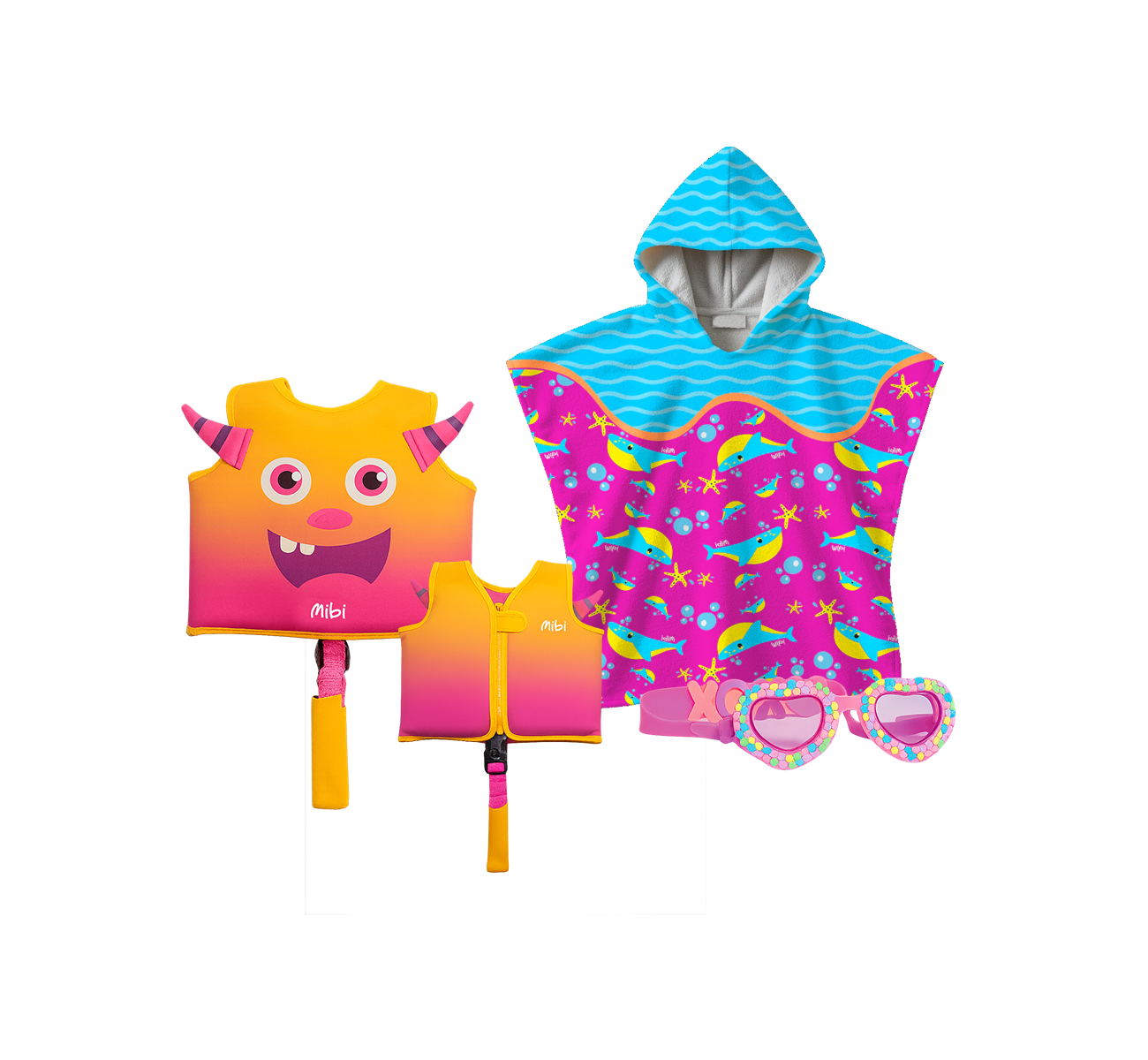 Kit Monster Pink Antiparras de plastico y silicona con lentes transparentes y proteccion UV. Ajuste Strap 100% Silicona resistente al agua. Tamano Kids. Chaleco de flotacion disenado para brindar seguridad y comodidad a los ninos durante sus primeras experiencias en el agua. Agarre: Cierre + Central con straps y cinturon. Edad: 3 a 6 anos. Poncho tela microfibra liviana extra absorbente y de secado rapido. Tamano: 60x60cm aprox.