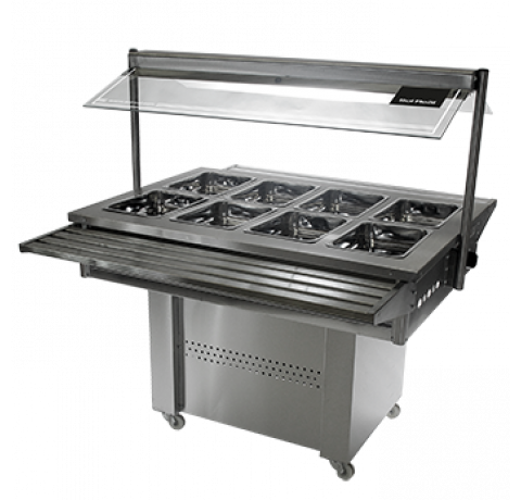 Totalmente construido en acero inoxidable esmerilado. 8 bandejas Gastronorm, de acero inoxidable 304 tipo quirúrgico de 325 x 265 x 65 mm. Cúpula de vidrio templado. Deslizador de bandejas en ambos lados. Cocción por baño maría. Bacha con exclusa de desagote. Ruedas giratorias para fácil deslizamiento. Kilocalorías/h: 5.500