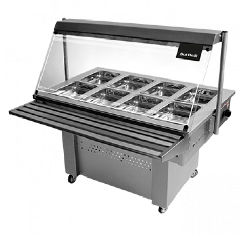 Totalmente construido en acero inoxidable esmerilado. 8 bandejas Gastronorm, de acero inoxidable 304 tipo quirúrgico de 325 x 265 x 65 mm. Frente de vidrio templado. Deslizador de bandejas. Cocción por baño maría. Bacha con exclusa de desagote. Ruedas giratorias para fácil deslizamiento. Kilocalorías/h: 5.500