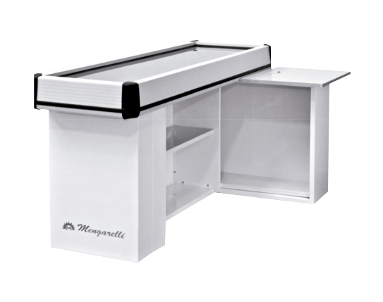 Con mesa para caja PASILLO: Ancho: 510 mm Largo: 1540 mm. Alto: 820 mm Mesada de acero inoxidable MESA PARA CAJA: Ancho: 500 mm Largo: 560 mm. Alto 880 mm Mesada de laminado plástico con PVC No incluye Gaveta Recaudadora. https://www.industriasmengarelli.com/space-recto/