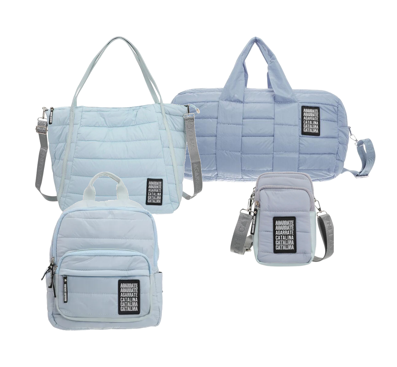 SET MOCHILA CARTERA BOLSO Y PORTACELULAR CELESTE AGARRATE CATALINA