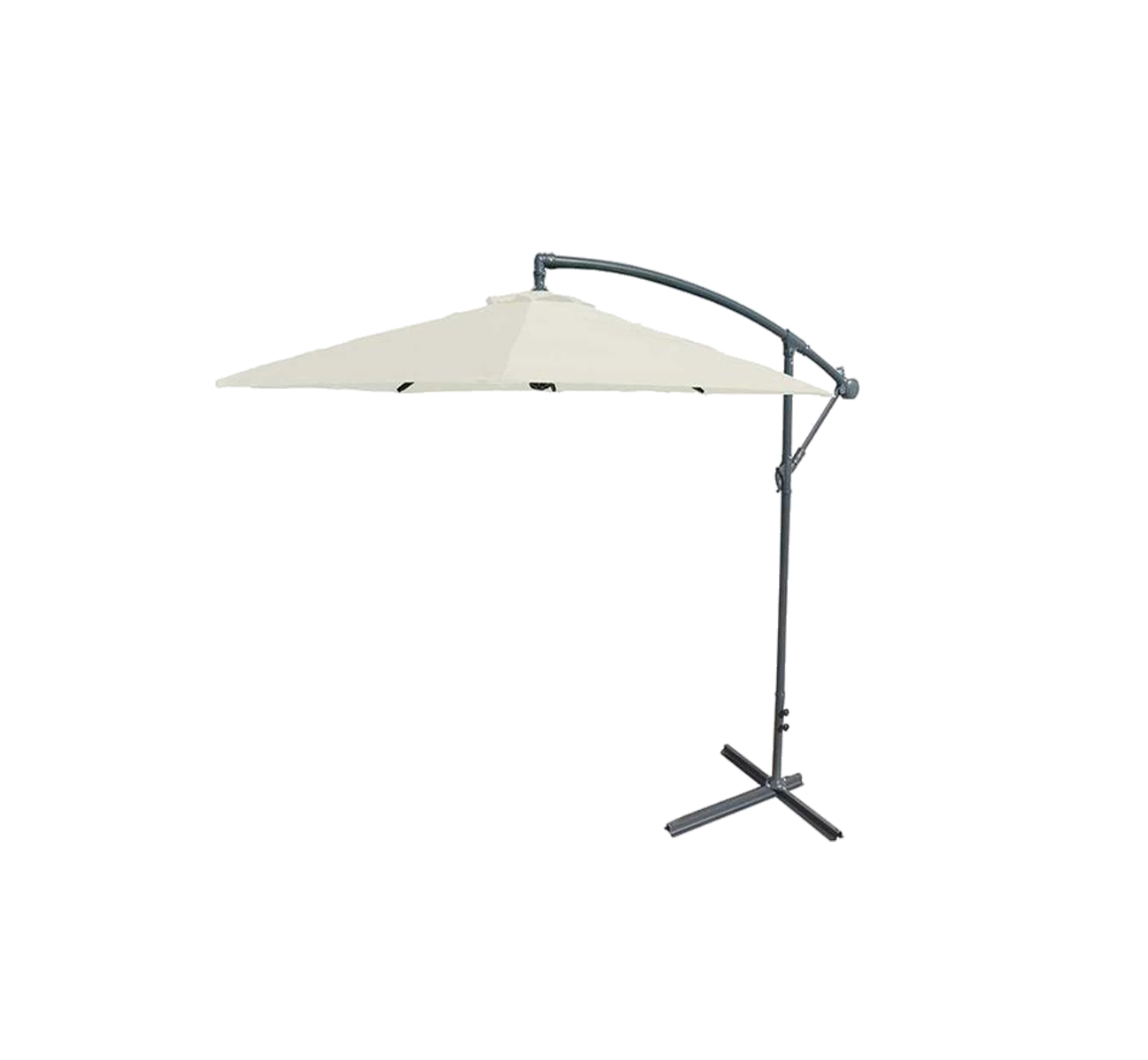 SOMBRILLA PARASOL LATERAL 2,70 MT CAÑO ACERO POLIESTER BEIGE CON BASE DE HIERRO LAURY Base en forma de cruz con orificios para amurar Altura regulable y reclinable Tela poliester 200 gr 8 varillas de acero de 12×18 mm Cano acero 42×48 mm Inclinacion de metal Diametro: 2,70 mt Apertura y cierre con manivela
